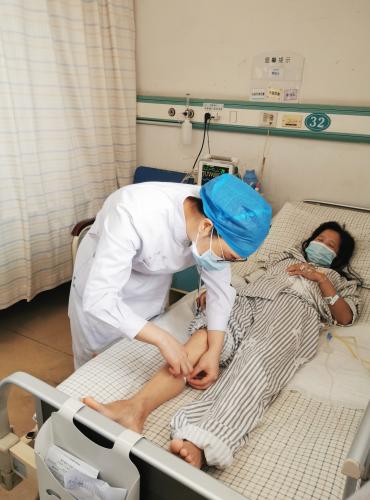 我正在给一位卵巢癌术合并下肢静脉血栓的患者测量腿围,测量的过程中需要我们动作轻柔,同时也需要我们细致的观察阿姨的腿是否出现异常改变,在临床上,爱心,细致,责任心是我们必不可少的品质